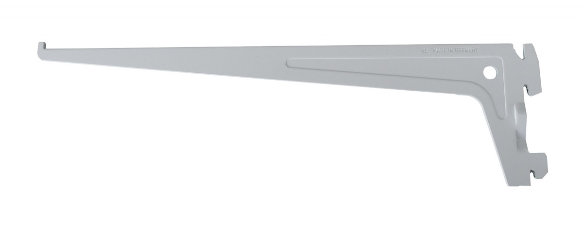 Správny nosník k tejto polici je najbližší kratší, teda 250 mm. Upevnenie prebieha tak, že zo spodnej strany police si v nieste nosa na nosníku (výstupok na konci nosníka) vyvŕtate do police dierku. Nosník vložíte do nástennej lišty a policu položíte na nosník.