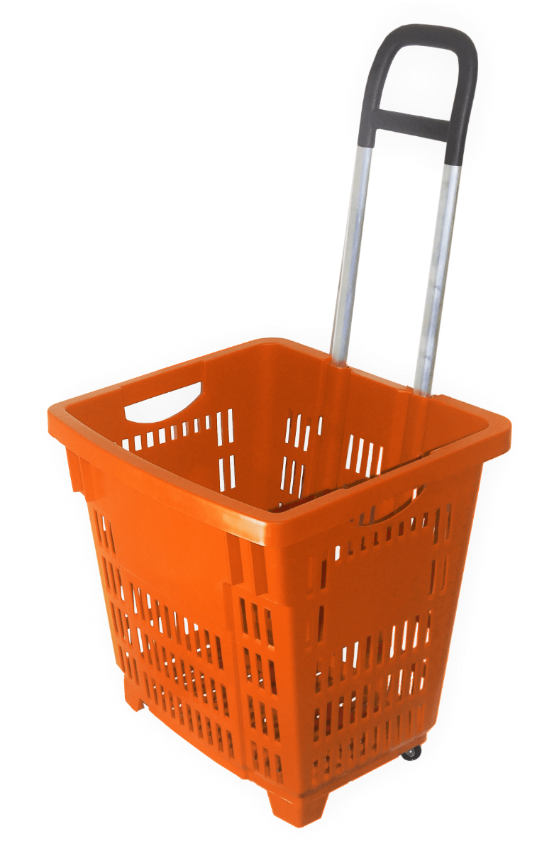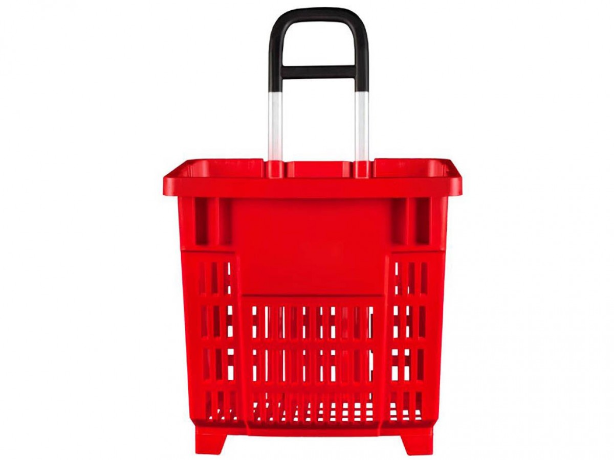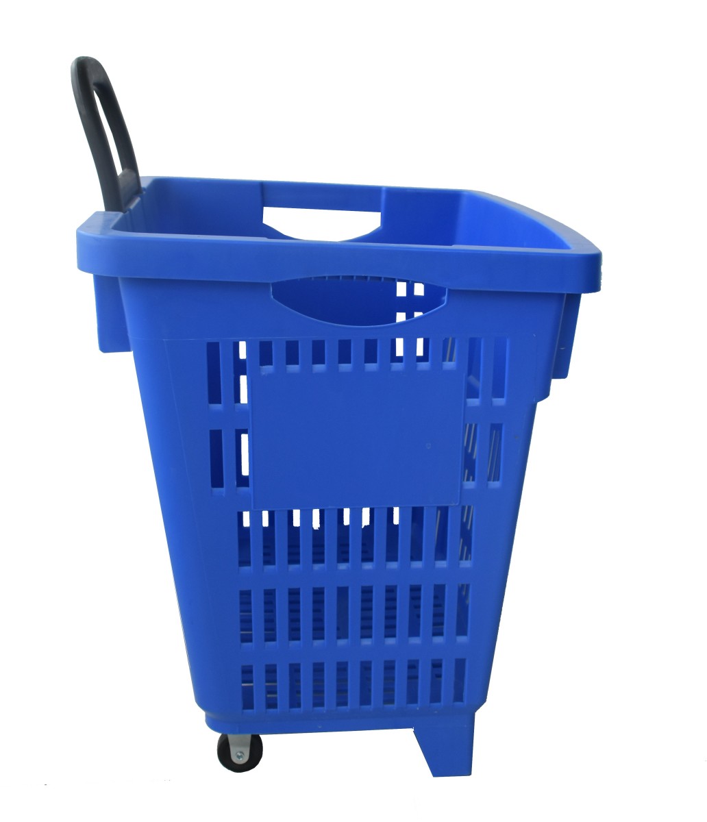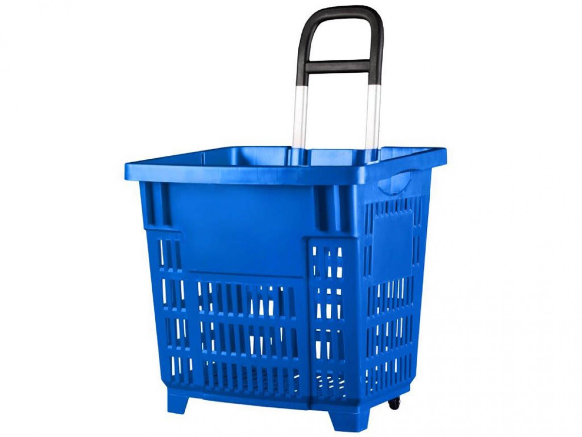 Plastový kôš hlboký s 2 plastovými priamymi kolieskami a 1 výsuvnou rúčkou na ťahanie košíka.