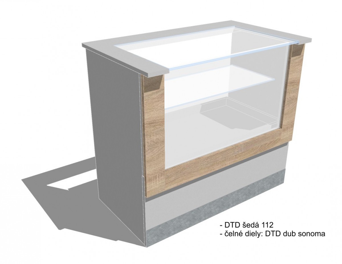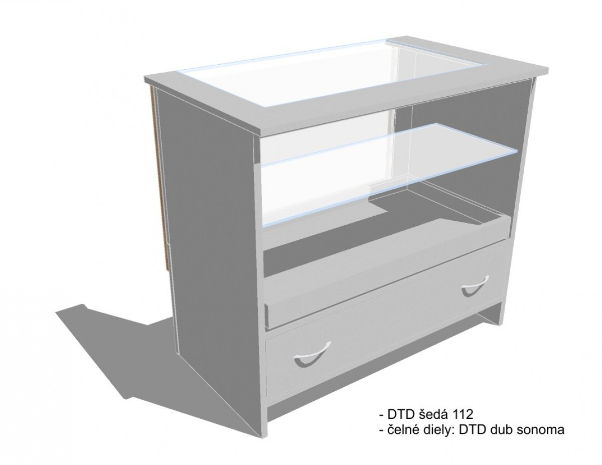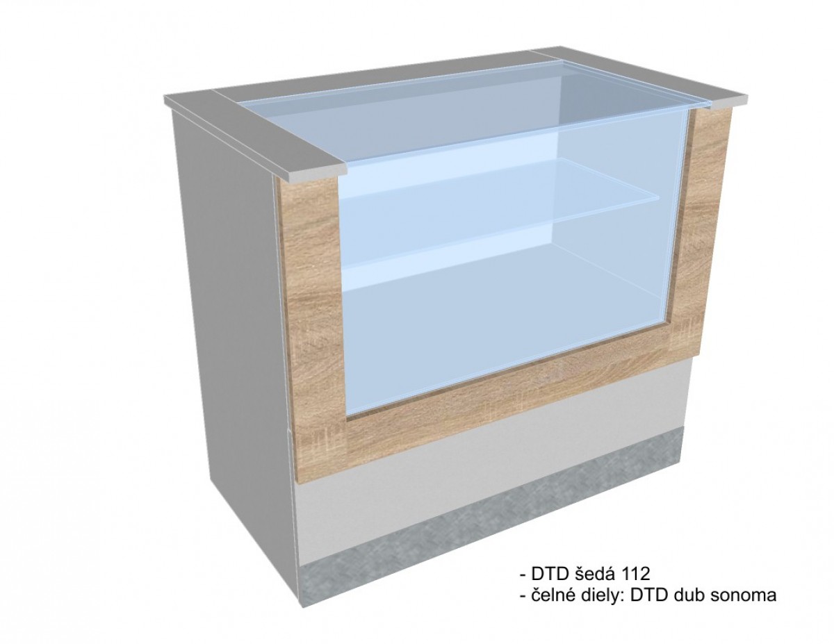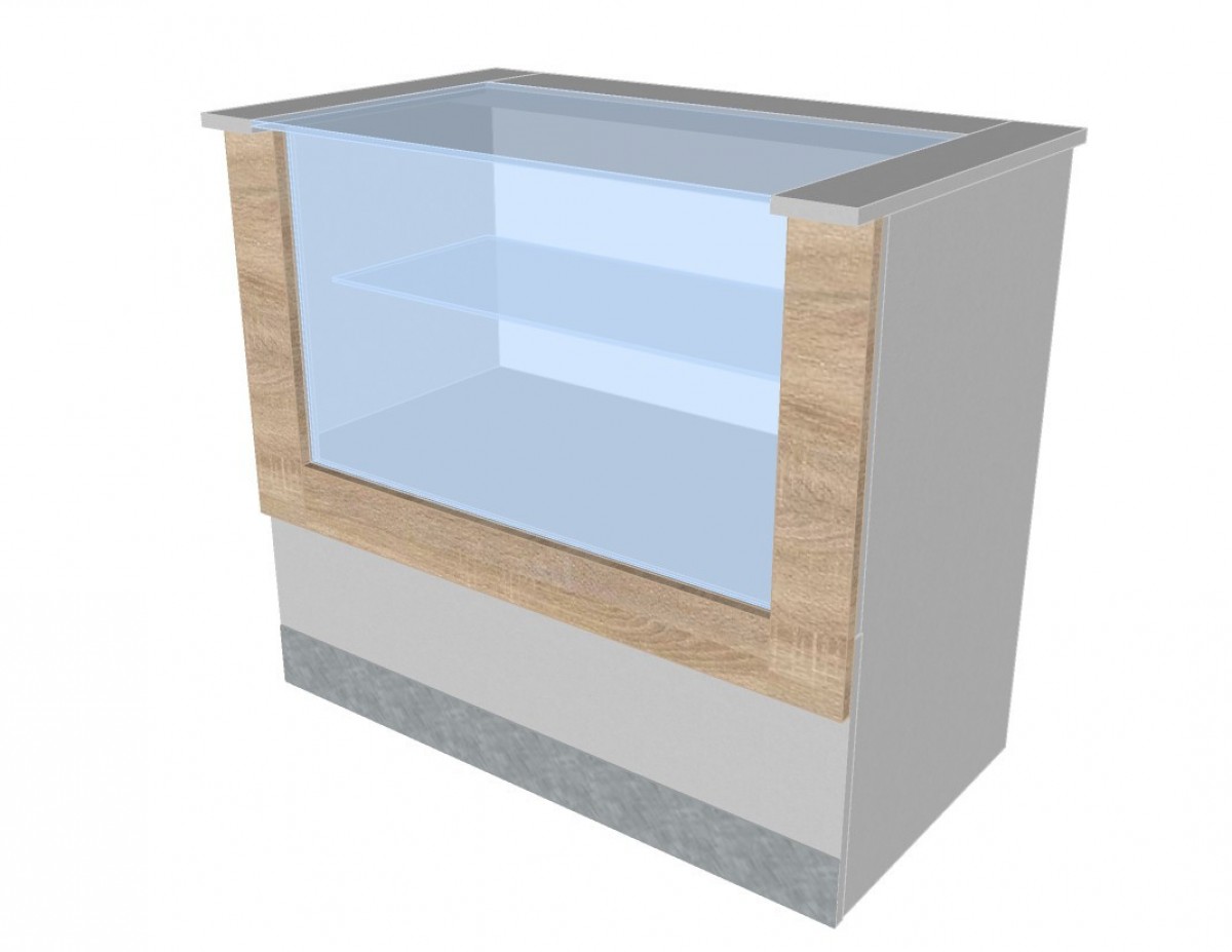 Vitrína s 1× sklenenou policou, 1× stredovou a 1× spodnou zásuvkou a nerezovým okopovým soklom.