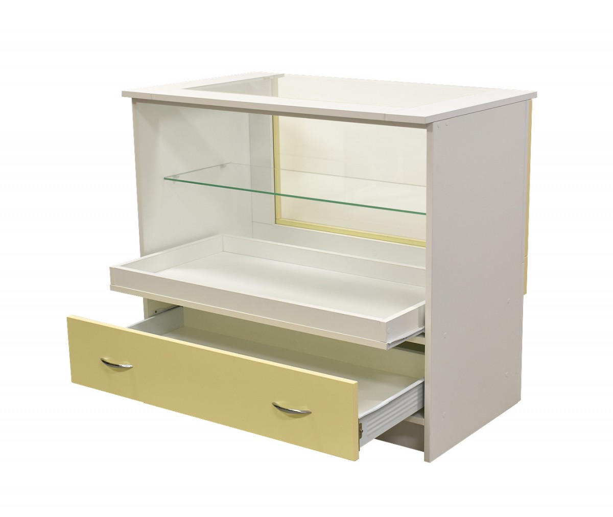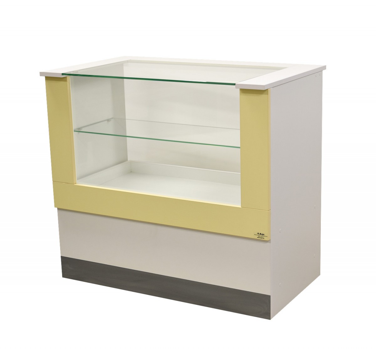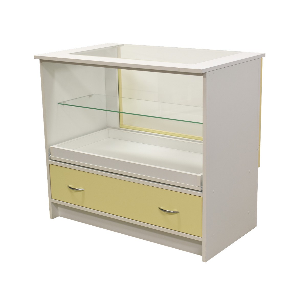 Vitrína s 1× sklenenou policou, 1× stredovou a 1× spodnou zásuvkou a nerezovým okopovým soklom.