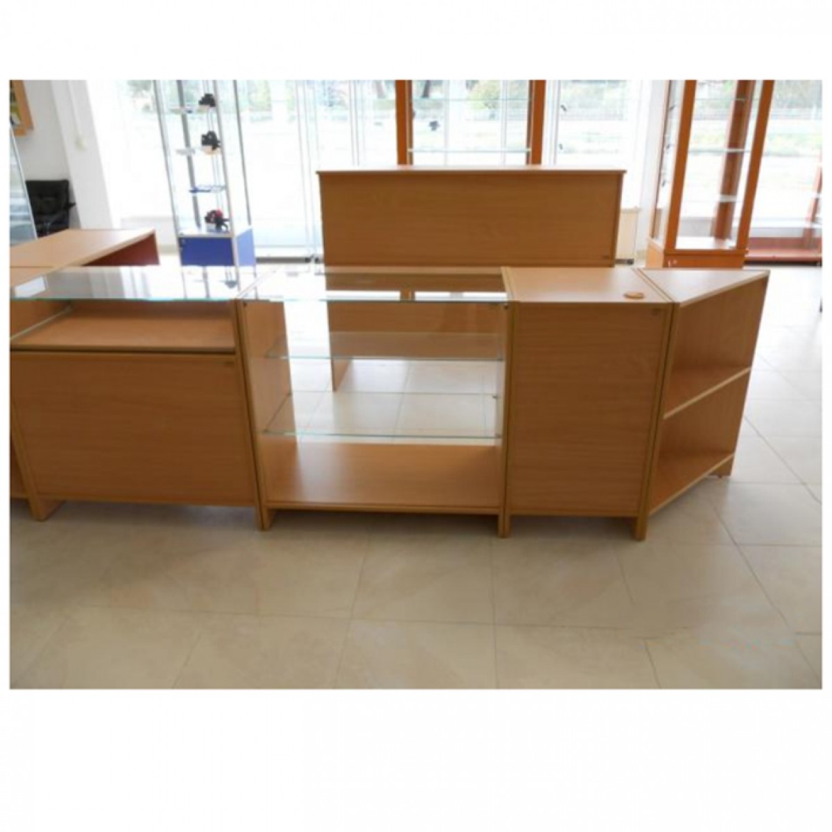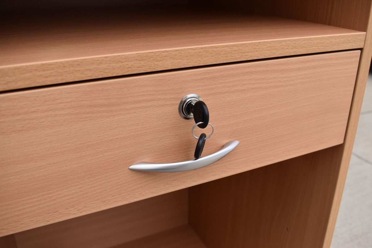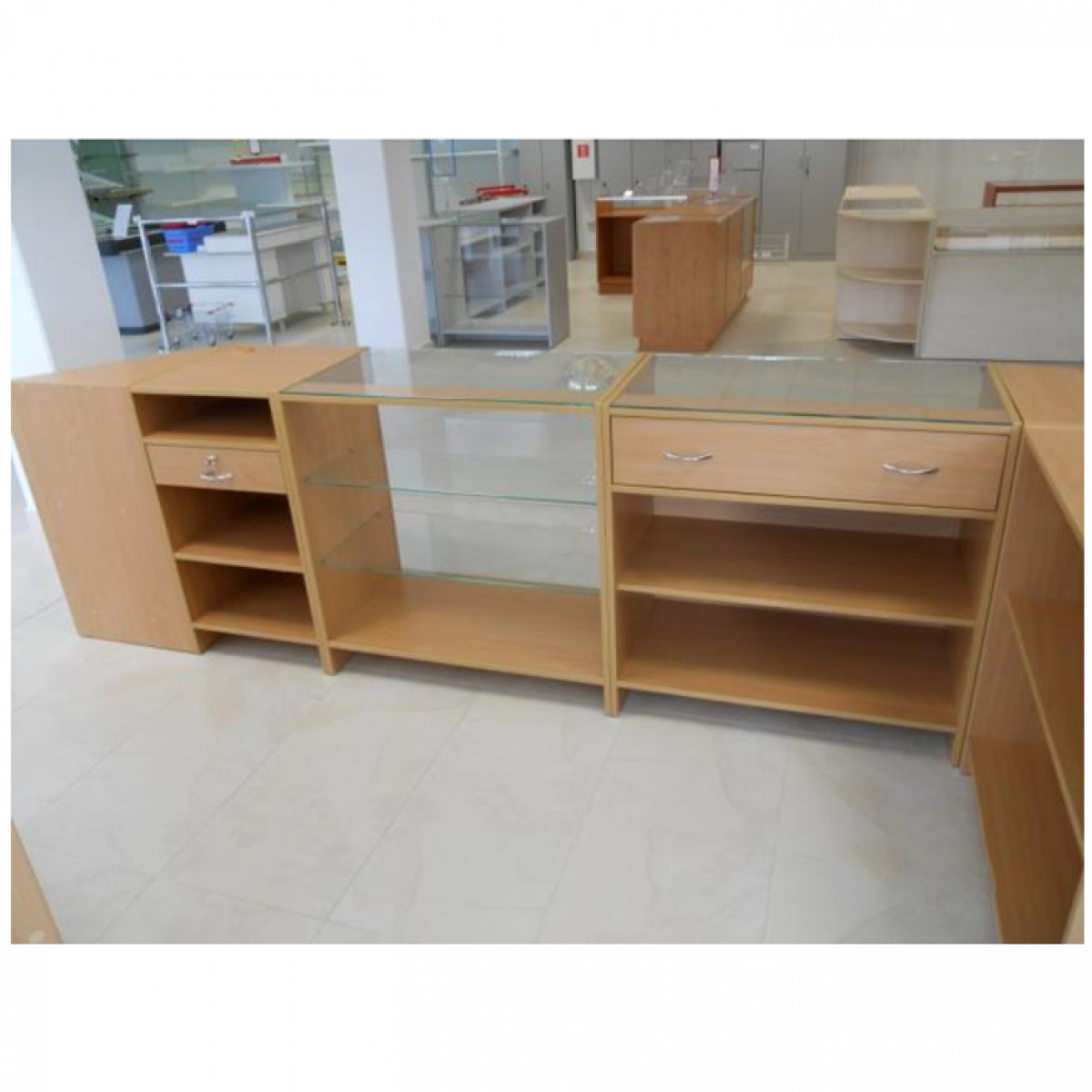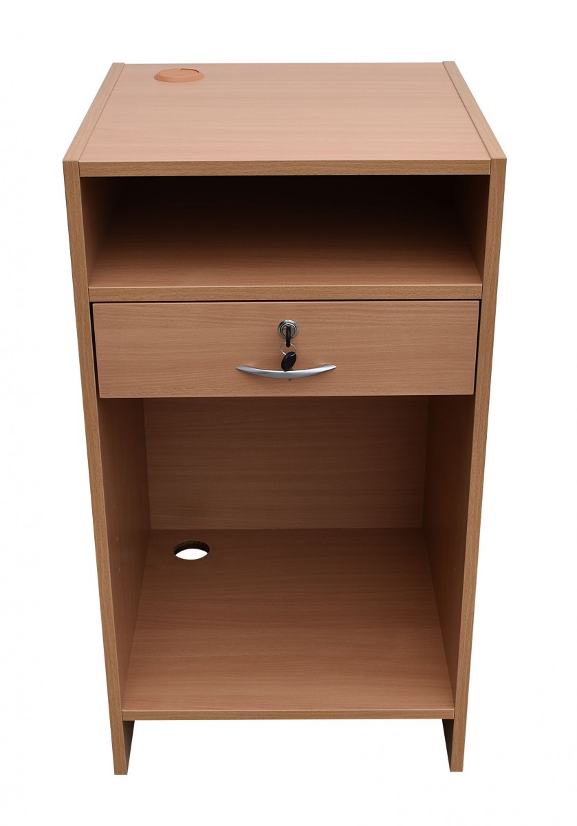 V cene pultu je úložný priestor na peňažnú zásuvku v hornej časti pultu, zásuvka so zámkom a káblová priechodka na hornej doske.