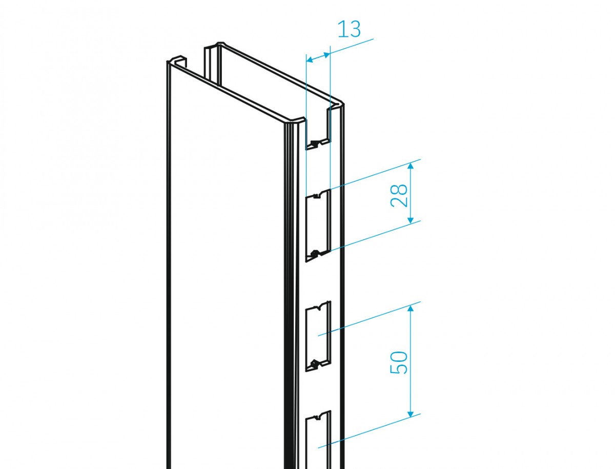 Štandardný profil s obojstranným dierovaním pre montáž konzol, panelov a iných regálových prvkov.