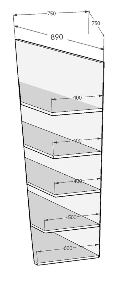 Kútový (vnútorný) regál - modul umožňuje plynulé spojenie dvoch prístenných regálových zostáv, ktoré sa stretávajú v 90° uhle, t.j. v kúte.