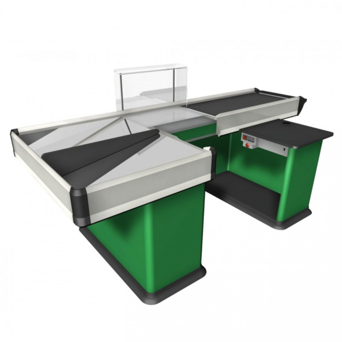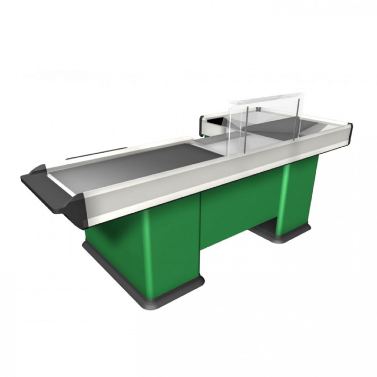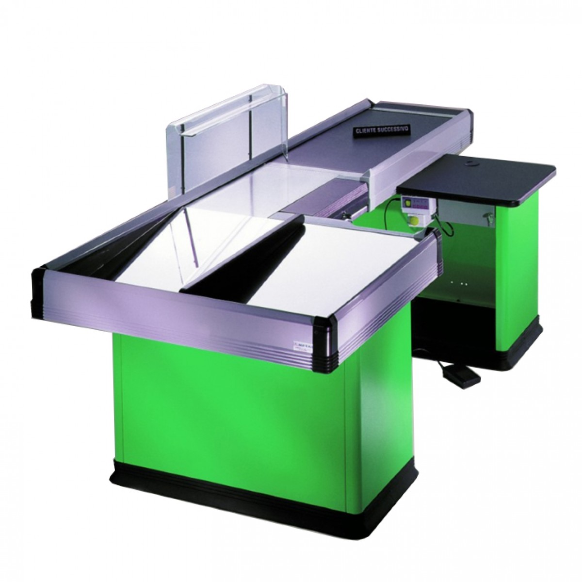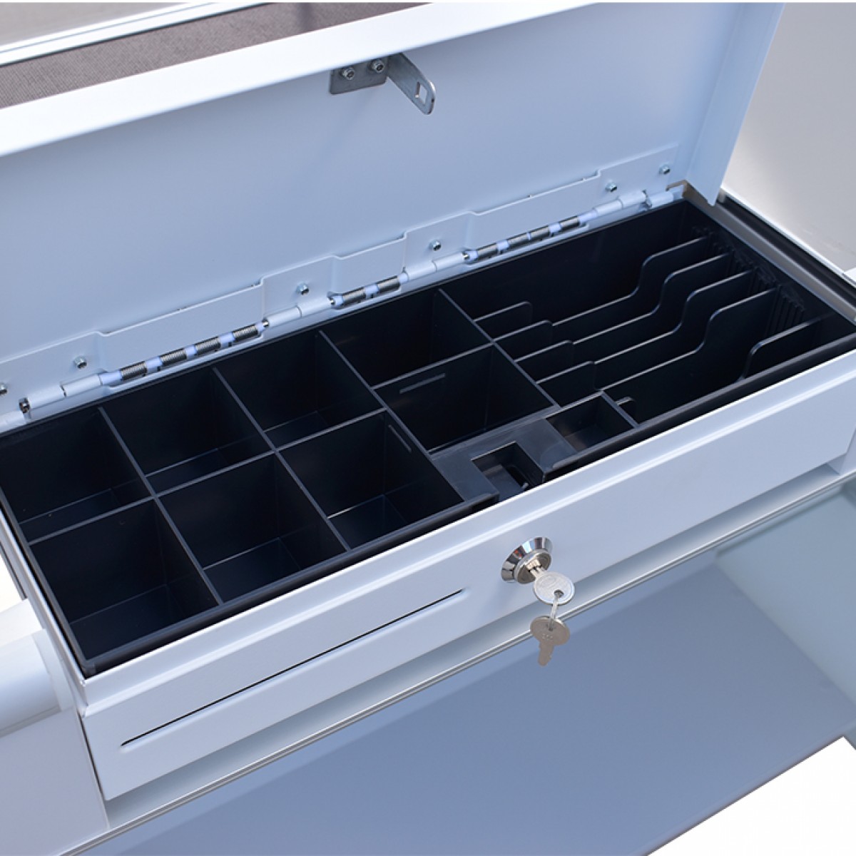 Pokladničný box dynamický (s posuvným pásom) a priestorom pre uzamykateľnú výklopnú Euro-peňažnú zásuvku, ktorý spĺňa všetky požiadavky stredne veľkých prevádzok.