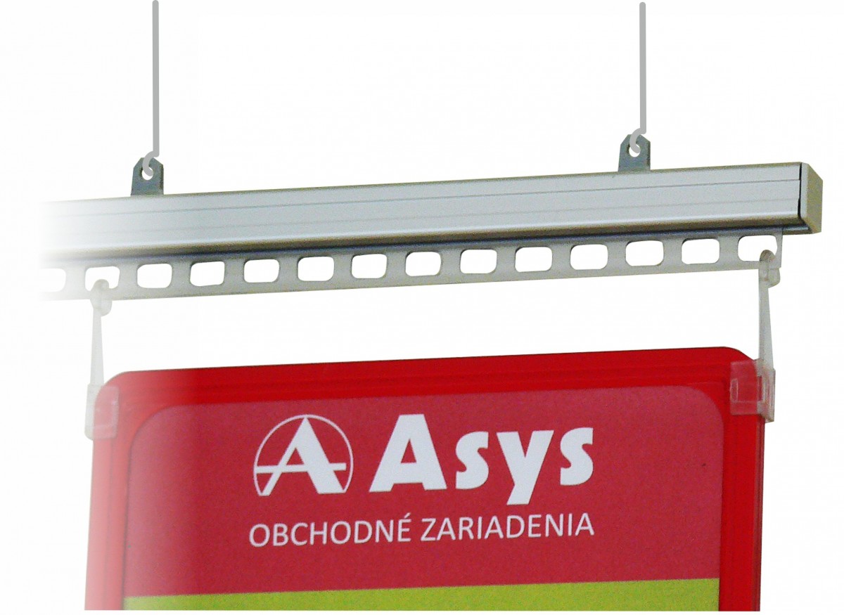 Hliníková závesná lišta s doplnkami pre uchytenie rámčekov, plagátov, tabuliek na strop.